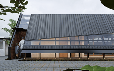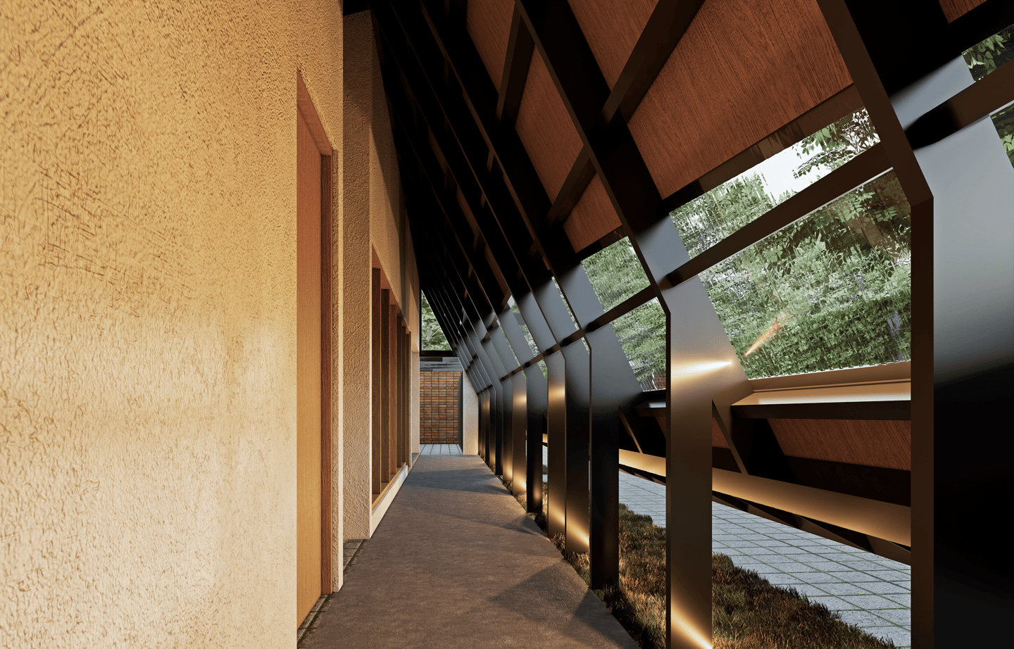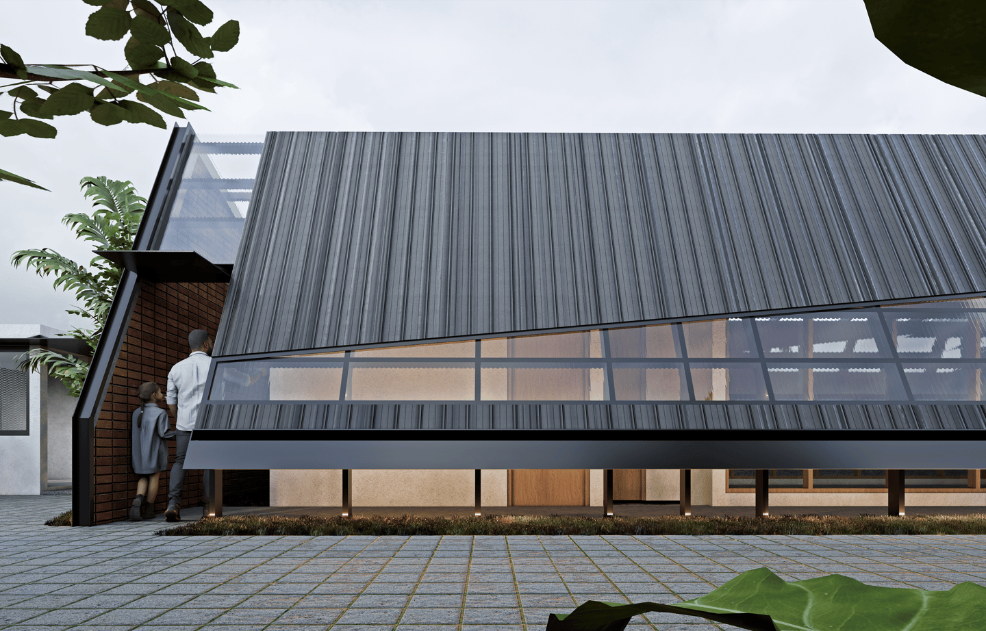 KESEDERHAAN DAN PRIVASI TERBENTUK OLEH ADANYA FASADE BERUPA ATAP YANG MENERUS DARI SISI DINDING BELAKANG HINGGA KE AREA DEPAN YANG MENUTUPI AREA SISI SAMPING BANGUNAN DAN DIPADUPADANKAN DENGAN SKYLIGHT SEHINGGA KORIDOR YANG TERBENTUK ANTARA RUANG DAN ATAP TETAP SEJUK DAN TERANG.